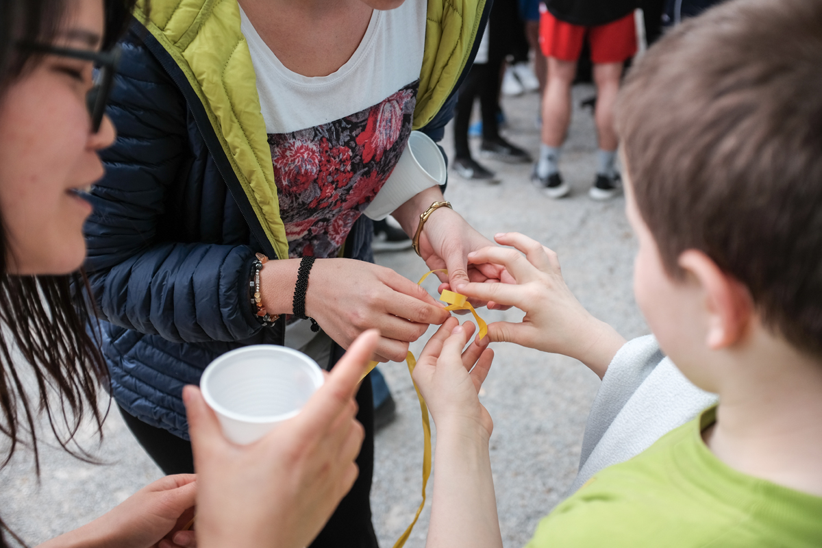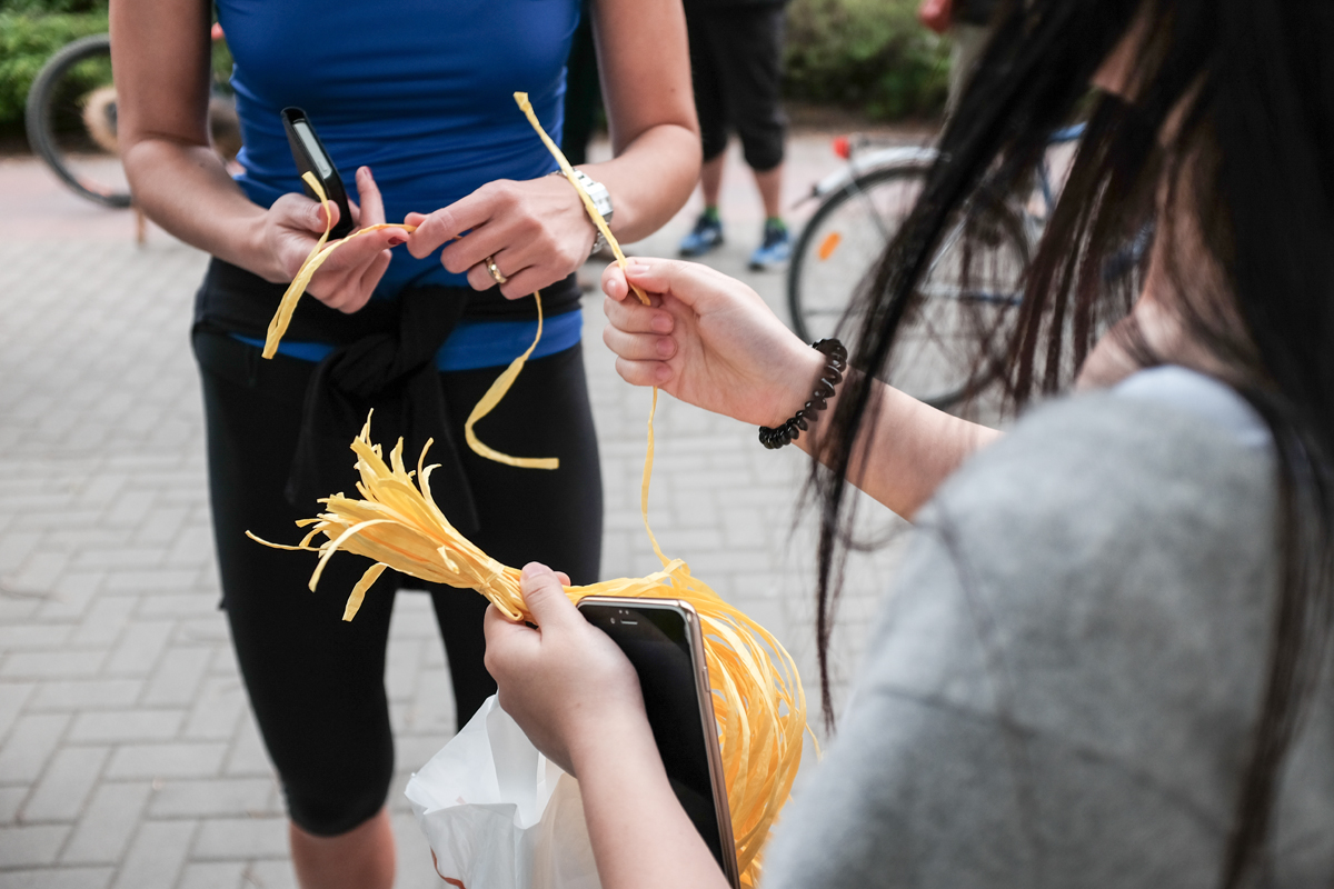 Nachdem alle am Ziel waren und sich eine Pause gönnten, wurde von den Organisatoren angekündigt, dass die Bändchen von allen, zu einem Band verknotet werden soll. Gesagt, getan. Nur ich hatte mein Bändchen nicht auf die schnelle von meinem Handgelenk entknoten können, also beließ ich es erstmal dabei.