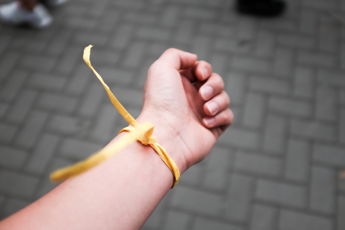 Ein älterer Herr fragte mich, was die gelben Bändchen zu bedeuten haben und deutete auf das Bändchen an meinem Handgelenk. Ich antwortete, dass die Farbe gelb in China die Farbe der Trauer sei. Daraufhin sprach die ältere Dame Ihren Beileid aus. In Ihren Augen konnte ich sehen, dass Sie es mehr als nur ehrlich meinte.