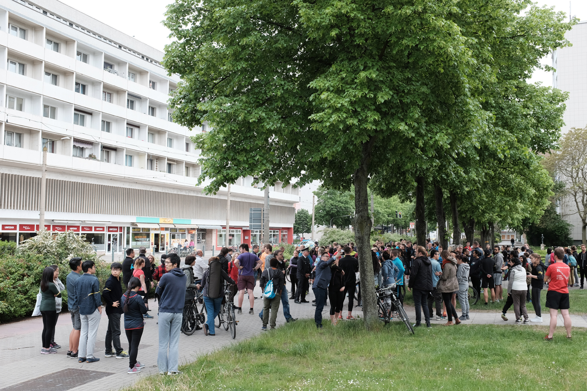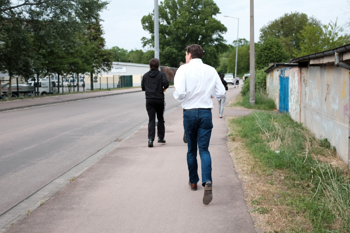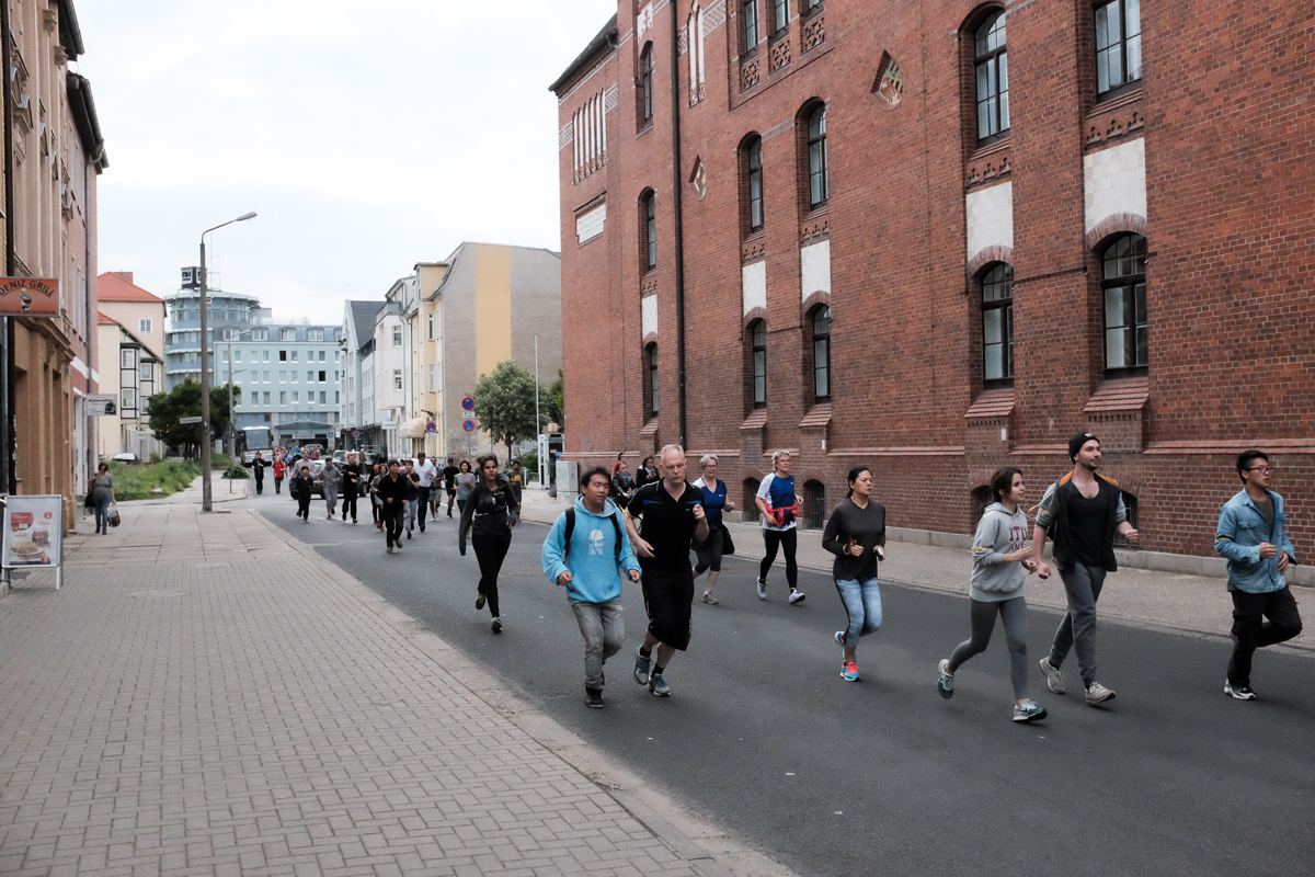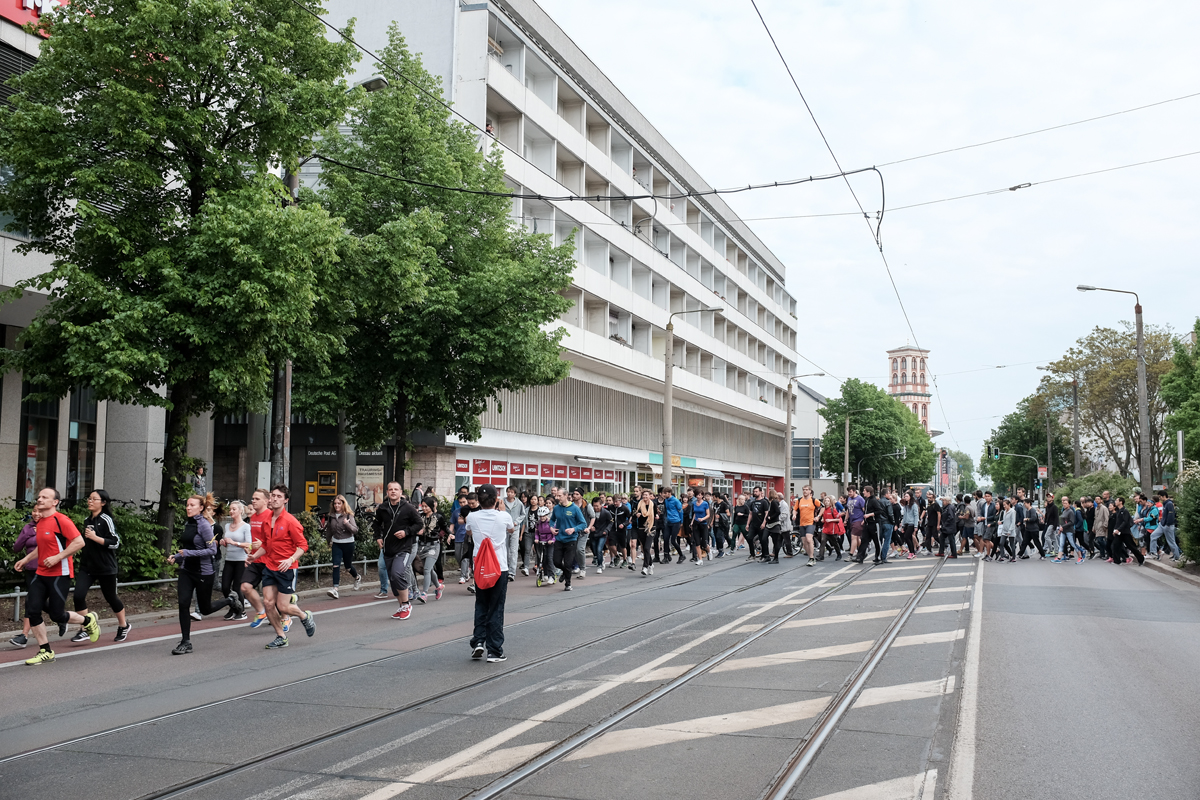 Ich lief also mit. Mittendrin im geschehen. Ich hatte keine Jogginghose, keine passenden Schuhe. Aber das war unwichtig. Die Route führte vom Rathaus-Center zur Stadtsparkasse, dann in Richtung Dessau-Nord zur Schlachthofstraße/Eduardstraße und dann zur Am Friedrichsgarten/Lessingstraße. Vor dort aus weiter zu den Gleisen der Wörtlitzer Bahn und weiter Richtung Norden bis zur Gaststätte Riekchen. Von da aus ging es an Dessau 05 vorbei weiter zum Schillerpark und dann zum UBA. Von dort aus zur Bahnhofsbrücke und zum Ziel – der Seminarplatz, Campus der Hochschule Anhalt.