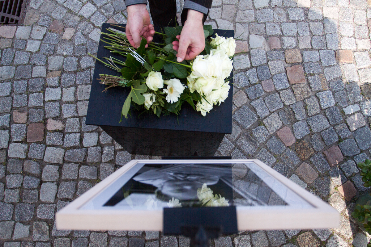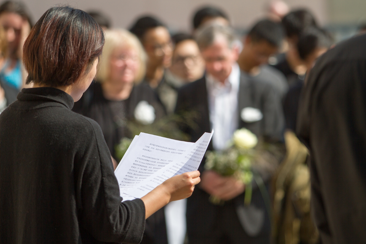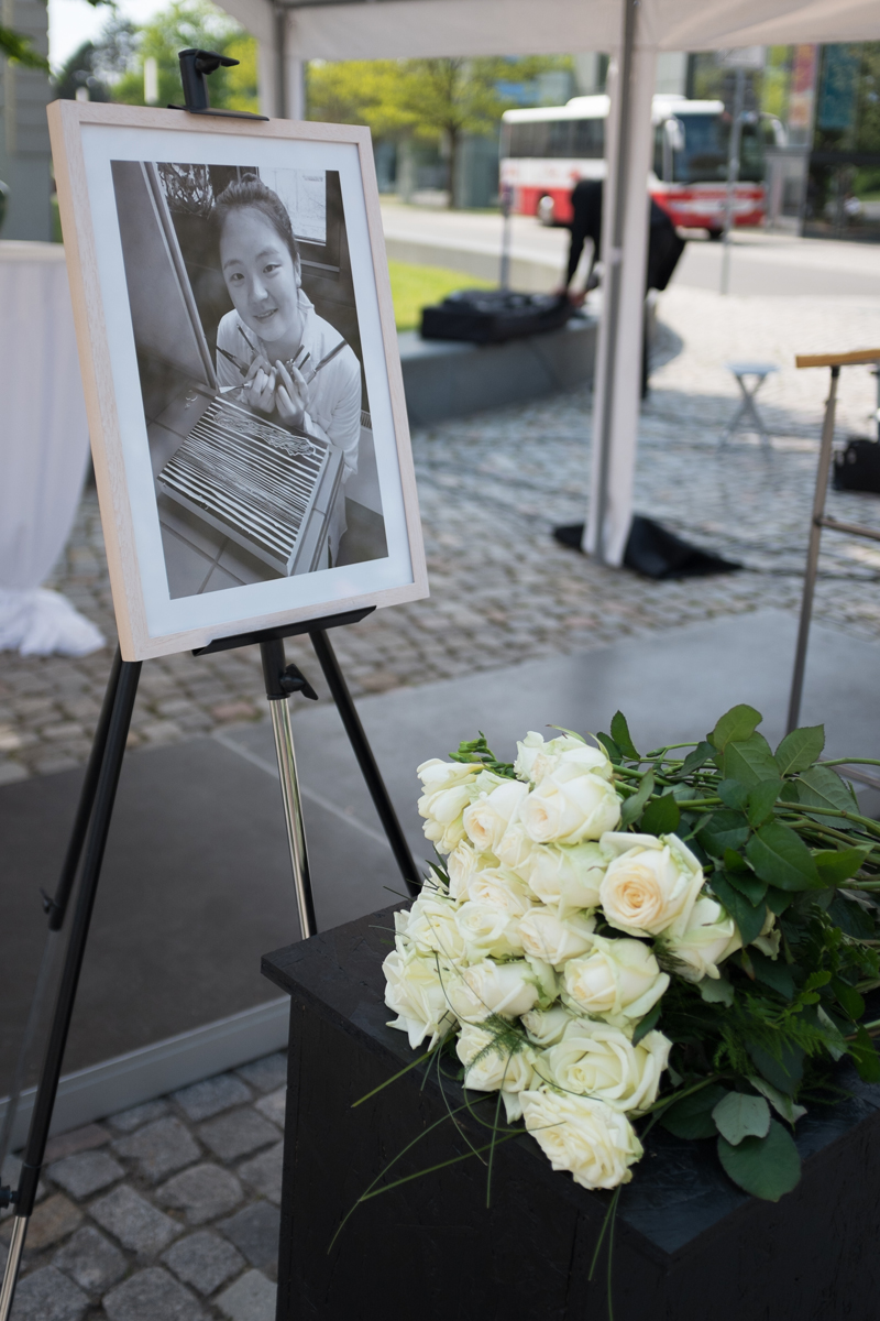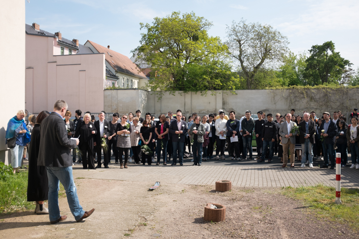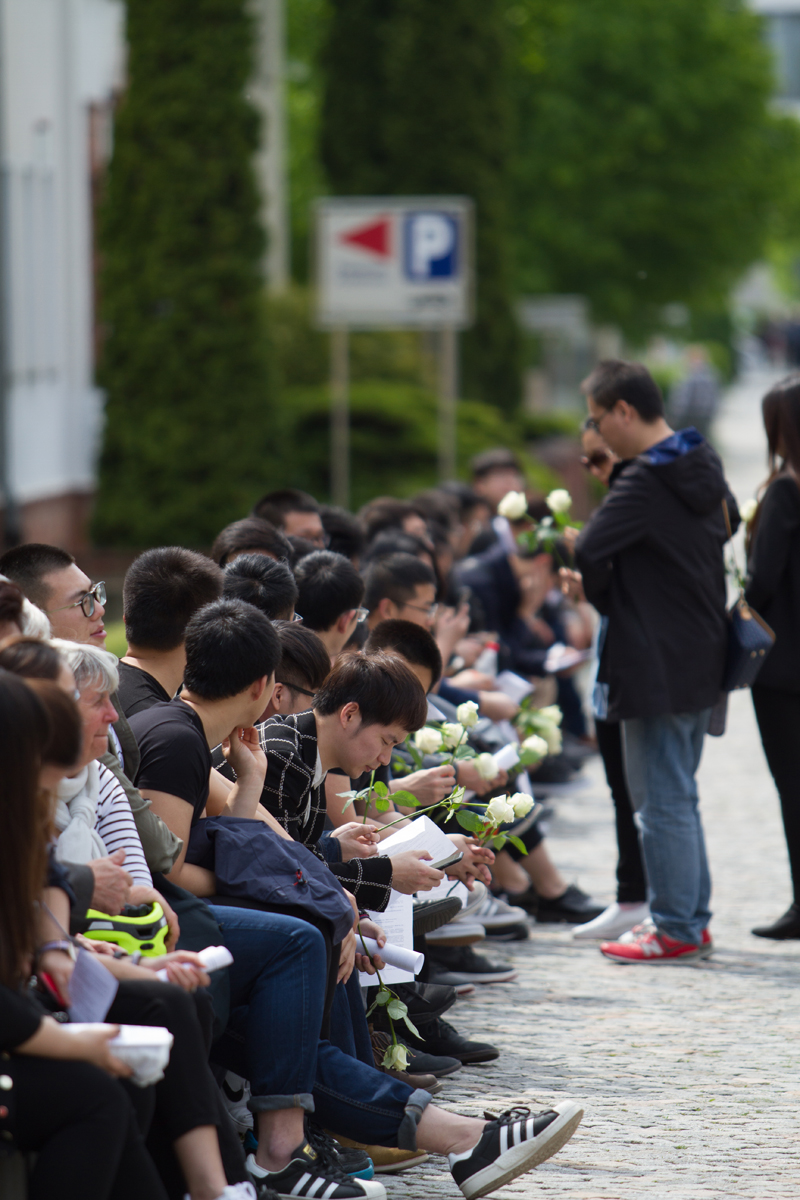 So fotografierte und dokumentiere ich mit einem Blumenstrauß in der linken Hand und die Kamera in der rechten Hand. Und hörte weiter, wie der Brief vorgelesen wurde. Es war still. Ich höre die Vögel zwitschern und tobende Kinder in einem nahen Kindergarten. Während der Brief noch auf deutsch vorgelesen wurde, stand die chinesische Studentin, die den Brief auf chinesisch vorgelesen hatte, daneben. In der prallen Sonnen. Regungslos mit gesenktem Kopf in ihrem schwarzen Kleid. Und in der prallen Sonnen zu stehen, war nicht angenehmen und der Brief war lang. Aber sie hielt es aus.