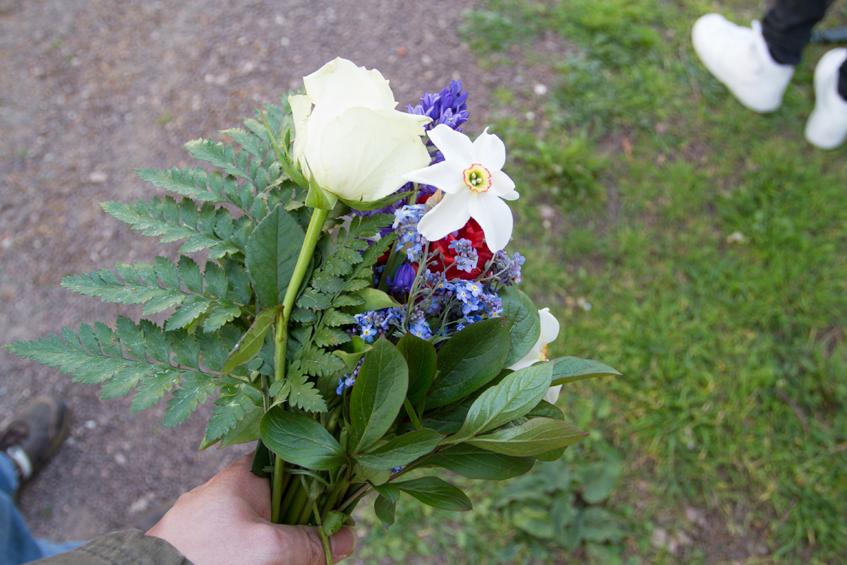 Ich wurde auch hier von einem älteren Mann überrascht angesprochen, den ich vorher schon war genommen hatte. Er war vermutlich schon Rentner oder kurz davor. Er hatte weiße Haare und trug eine Brille. Er hielt in seiner linken Hand einen kleinen Blumenstrauß mit einer weißen Rose. Er hatte einen goldenen Ehering. Er fragte mich, ob ich die Blumen für ihn zum Schluss dort hinlegen kann. Ich versprach ihm dies für ihn zu tun und er bedankte sich freundlich.