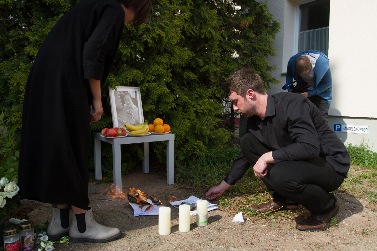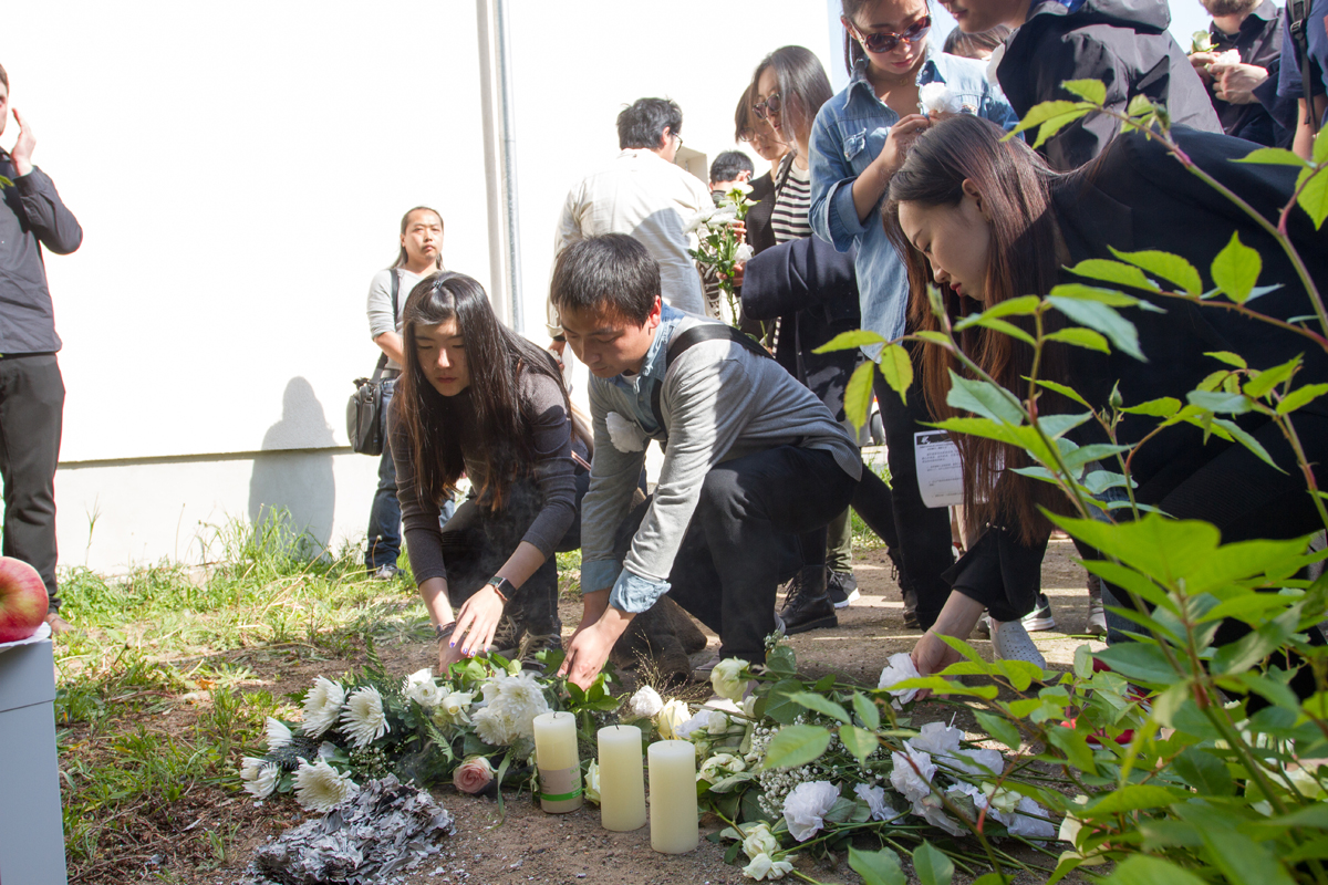 Nach den Gedenkreden wurde das Foto von Yangjie Li sorgfältig zum Tatort gebracht und erneut aufgestellt. Dort wo die Polizei ihre Leiche gefunden hatte. Dort wo auch die weiße Rose gepflanzt wurde, zur Erinnerung an sie.