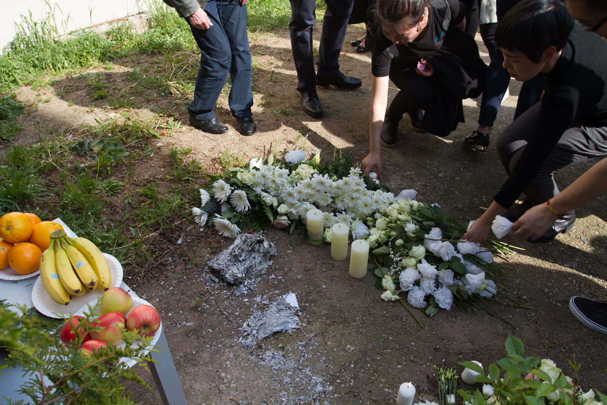 Während der Brief weiter vorgelesen wurde, legten Studentinnen Obst zum Foto von Yangjie Li und zündeten 3 Kerzen an. Und als der Brief zum Ende kam, wurde der Brief dann verbrannt. Die trauernden Besucher legten ihre Blumen – hauptsächlich weiße Rosen nieder und ich ebenfalls.